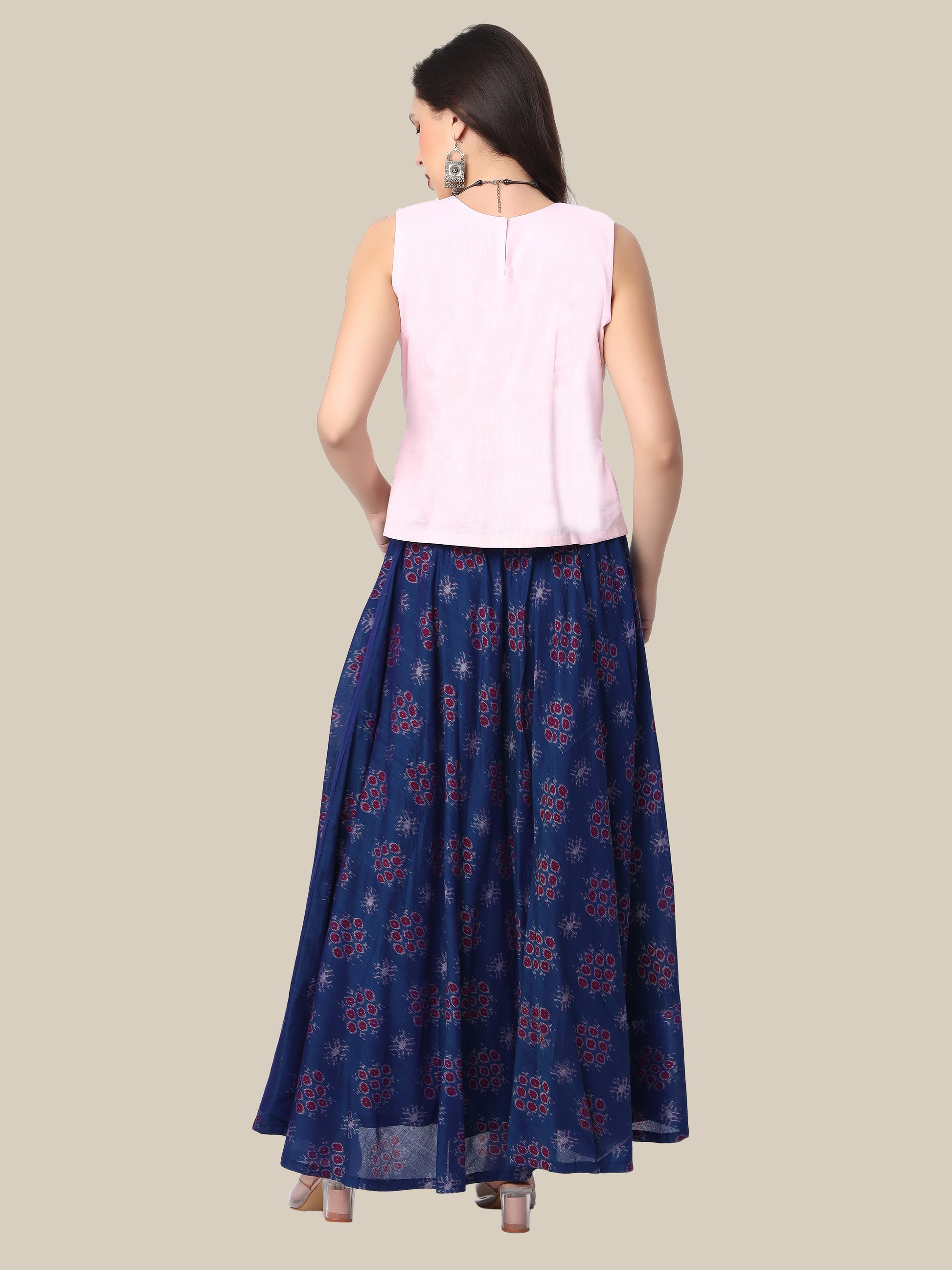 Make a stunning statement with this exquisite two-piece dress, crafted from premium double Ikat Sambalpuri cotton and pure Linen fabric. The beautifully tailored sleeveless top, tailored from pure Linen, is perfectly paired with a gorgeous flowy Sambalpuri skirt in an umbrella cut.